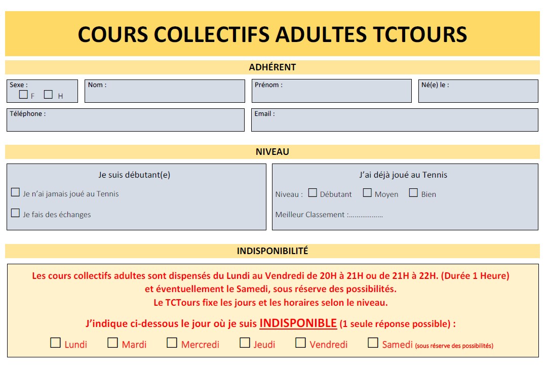 Vous souhaitez intégrer nos cours collectifs adultes (places limitées), adressez nous avec votre fiche d’inscription, la fiche Cours Adultes dûment remplie.